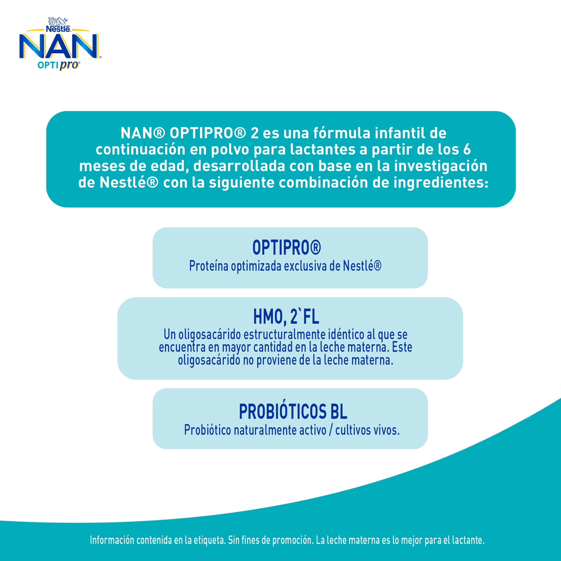 Suero dulce líquido de leche, Leche descremada en polvo, Mezcla de aceites vegetales [Aceite de oleína de palma, Aceite de palma, Aceite de colza bajo en ácido erúcico, Aceite de maíz, con Antioxidante (Palmitato de ascorbilo SIN 304) y Secuestrante (Ácido Cítrico SIN 330)], Citrato de Calcio, Concentrado de proteína de suero en polvo, Lactosa, Citrato de Potasio, Mezcla de Minerales [Sulfato de Hierro, Sulfato de Zinc y Sulfato de Cobre, con Regulador de la acidez (Ácido cítrico SIN 330)], Aceite de pescado [fuente de DHA, con Antioxidante (Concentrado de tocoferoles mixtos SIN 307b)], Emulsionante (Lecitina de soya SIN 322i), Mezcla de Vitaminas y Minerales [Vitamina C (Ascorbato de Sodio), Vitamina E (DL-alfa-tocoferil acetato), Nicotinamida, Vitamina B5 (Pantotenato de Calcio), Vitamina B1 (Mononitrato de tiamina), Vitamina A (Retinol acetato), Vitamina B6 (Piridoxina), Vitamina B2 (Riboflavina), Vitamina B9 (Ácido fólico), Sulfato de Manganeso, Yoduro de Potasio, Vitamina K1 (Fitomenadiona), Biotina, Selenato de Sodio, Vitamina D3 (Colecalciferol) y Vitamina B12 (Cianocobalamina)], Oligosacárido [2´-O- Fucosillactosa (2´FL)], Fosfato de Sodio, Cloruro de Magnesio, Coadyuvante (Ácido cítrico SIN 330), Reguladores de la acidez (Hidróxido de Potasio SIN 525 e Hidróxido de Sodio SIN 524), Nucleótidos (CMP, UMP, AMP, GMP), Probiótico (B. lactis 1x10^6 UFC/g).
