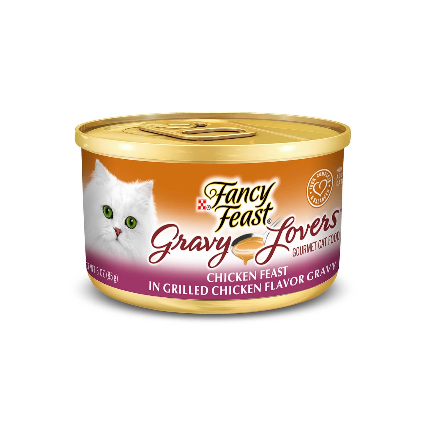 PURINA FANCY FEAST® GRAVY LOVERS CHICKEN FEAST IN GRILLED CHICKEN FLAVOR GRAVY, incluye tiernos y delicados bocaditos de pollo cocinados y servidos sobre una generosa salsa gourmet.