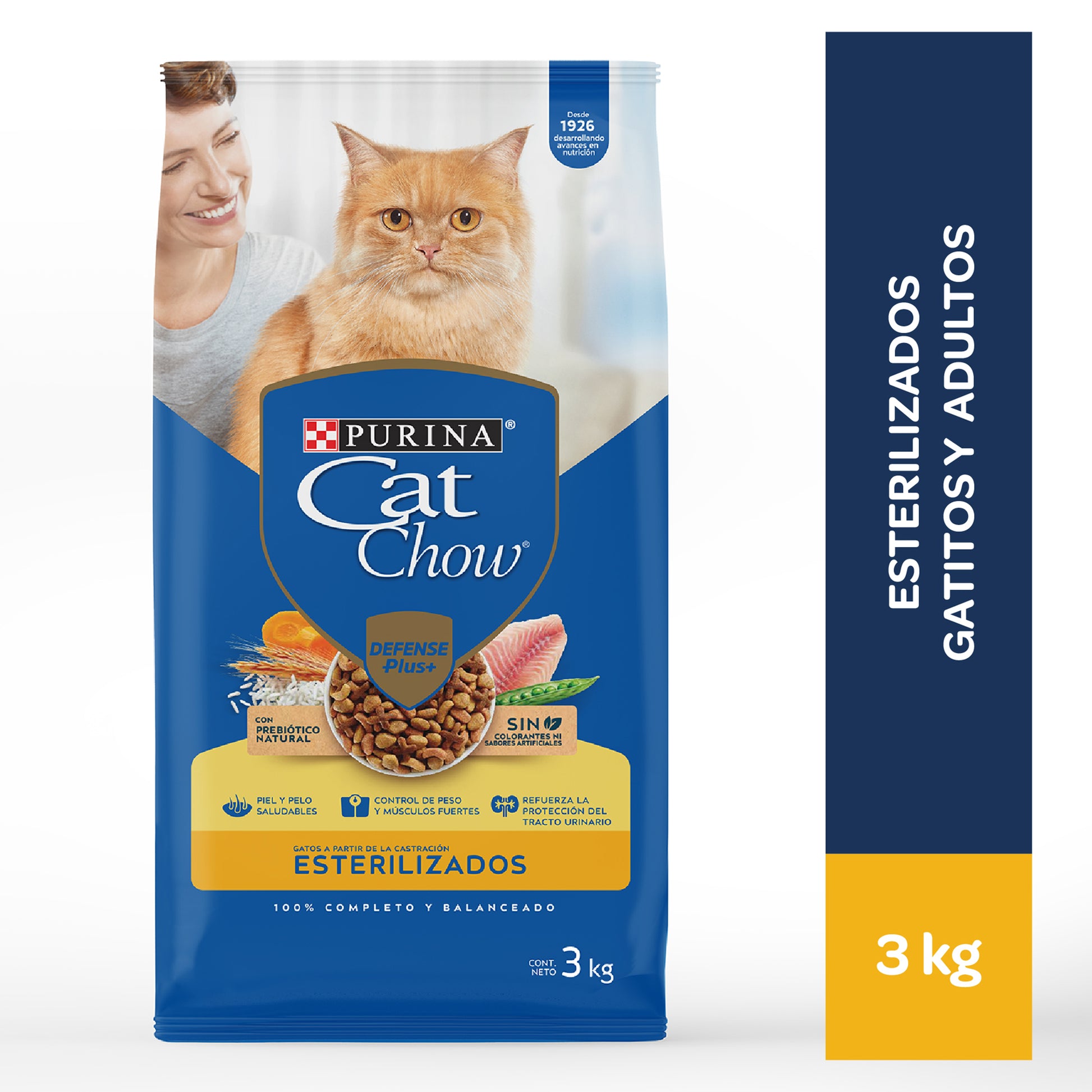 Purina Cat Chow® Esterilizados, es un alimento completo y balanceado para gatos esterilizados a partir de los 6 meses de edad, es decir, va para etapa gatitos y gatos adultos. Contiene 3 fuentes de fibras de alta digestibilidad. Además, contiene "Defense Plus", una exclusiva combinación de antioxidantes que ayudan a fortalecer su sistema inmunológico y provee de defensas naturales.