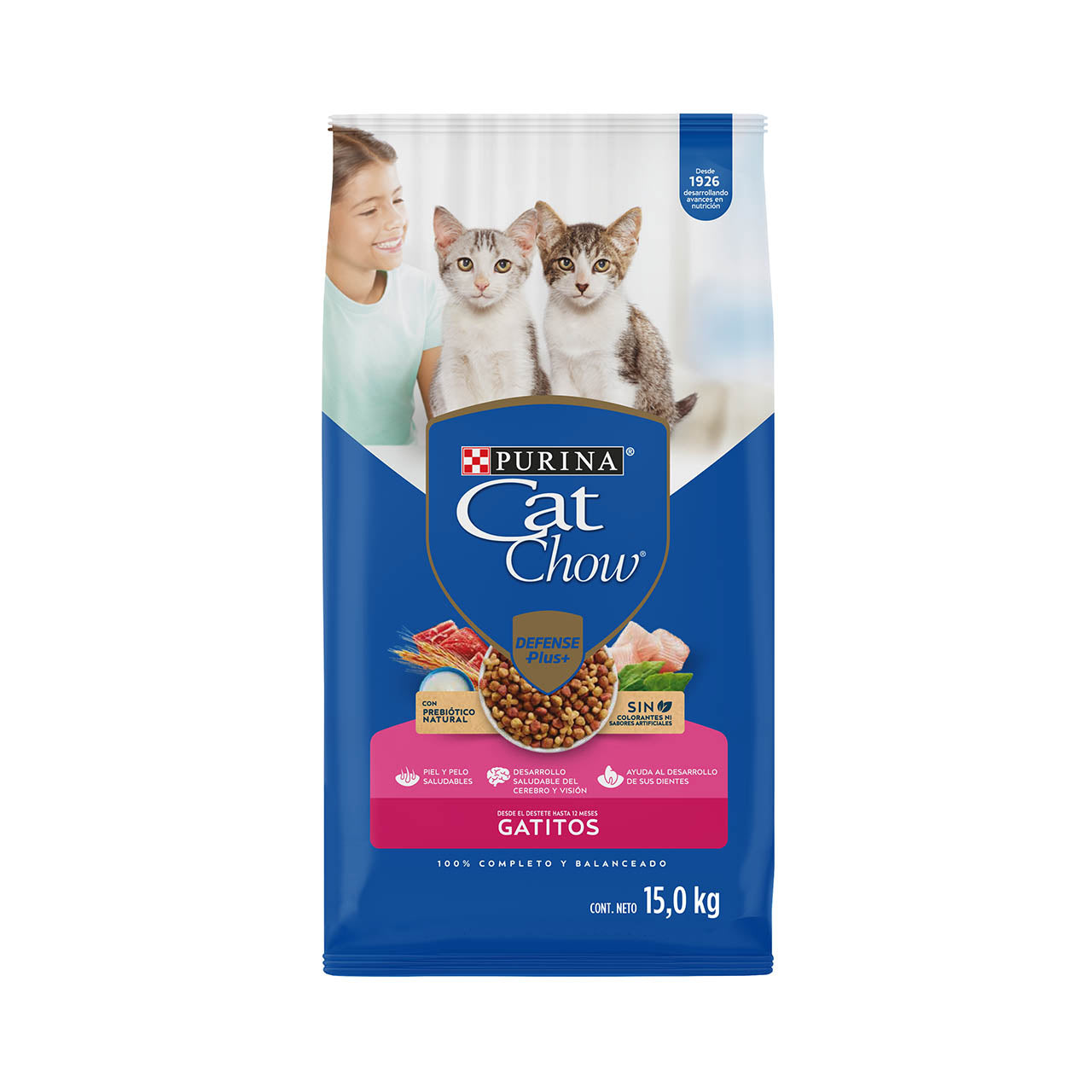 Es por eso que desarrollamos PURINA® CAT CHOW® GATITOS PESCADO, CARNE Y LECHE, desde el destete hasta 12 meses con DEFENSE PLUS, hecho con todos los nutrientes que tu gatito necesita para favorecer un crecimiento sano, y mejorado con la inclusión de un prebiótico natural.