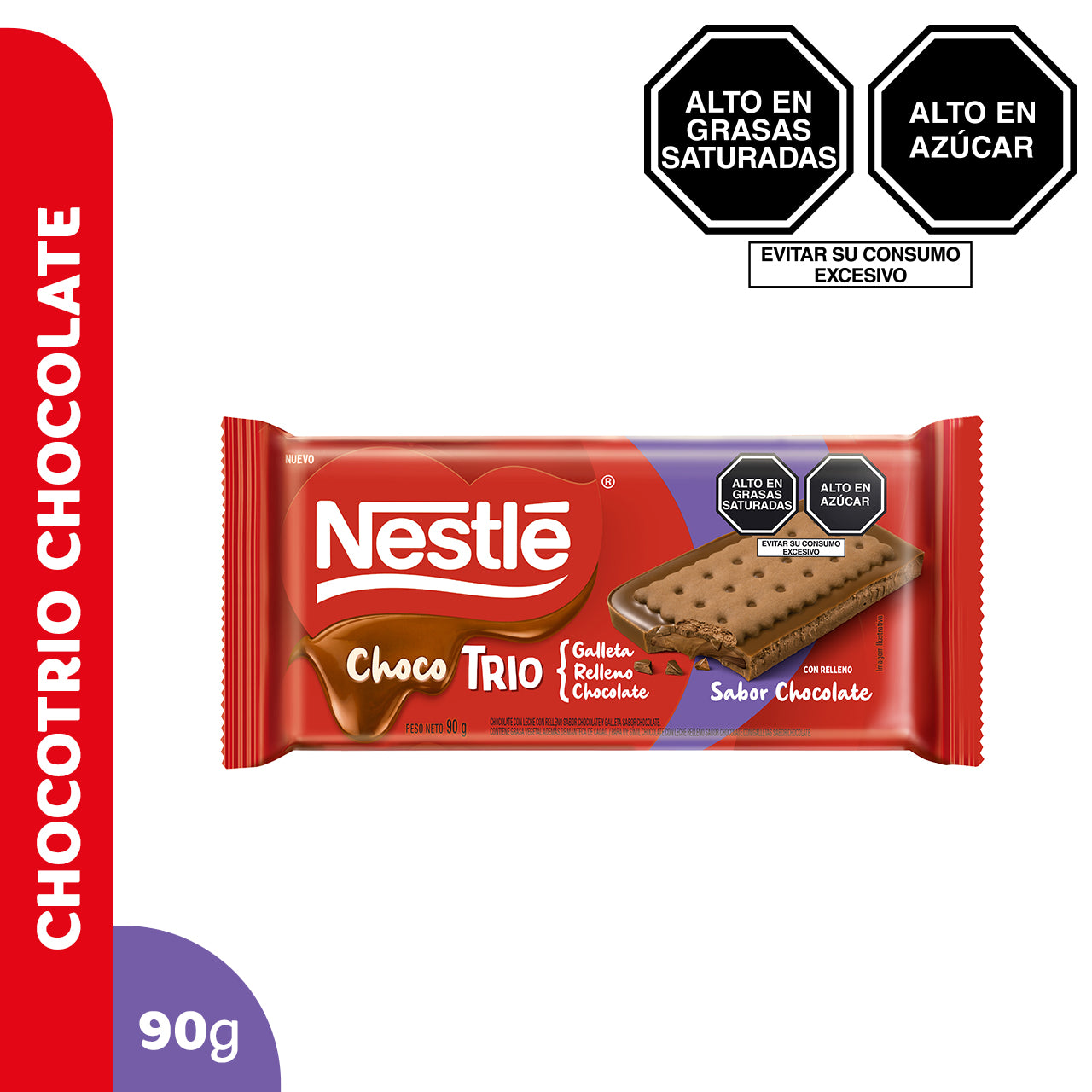 Chocolate con leche [Azúcar, Leche entera, Manteca de cacao, Masa de cacao, Grasa vegetal, Permeado de suero de leche, Emulsionantes (Lecitina de soya y Ésteres poliglicéridos de ácido ricinoléico interesterificado) y Saborizantes], Relleno sabor chocolate [Azúcar, Leche entera, Galleta sabor chocolate, Grasa vegetal, Masa de cacao, Manteca de cacao, Permeado de suero de leche, Grasa anhidra, Emulsionantes (Lecitina de soya y Ésteres poliglicéridos de ácido ricinoléico interesterificado) y Saborizantes] y Galleta sabor chocolate [Harina de trigo fortificada (Hierro, Vitaminas (B1, B2, B3, Ácido fólico, Zinc), Azúcar, Agua, Grasa vegetal, Cacao en polvo, Almidón de yuca, Colorante (Caramelo IV), Leudantes (Carbonato ácido de amonio, Carbonato ácido de sodio y Fosfato diácido de calcio), Emulsionante (Lecitina de soya), Sal, Saborizante, Agente de tratamiento de las harinas (Metabisulfito de sodio) y Leche entera].