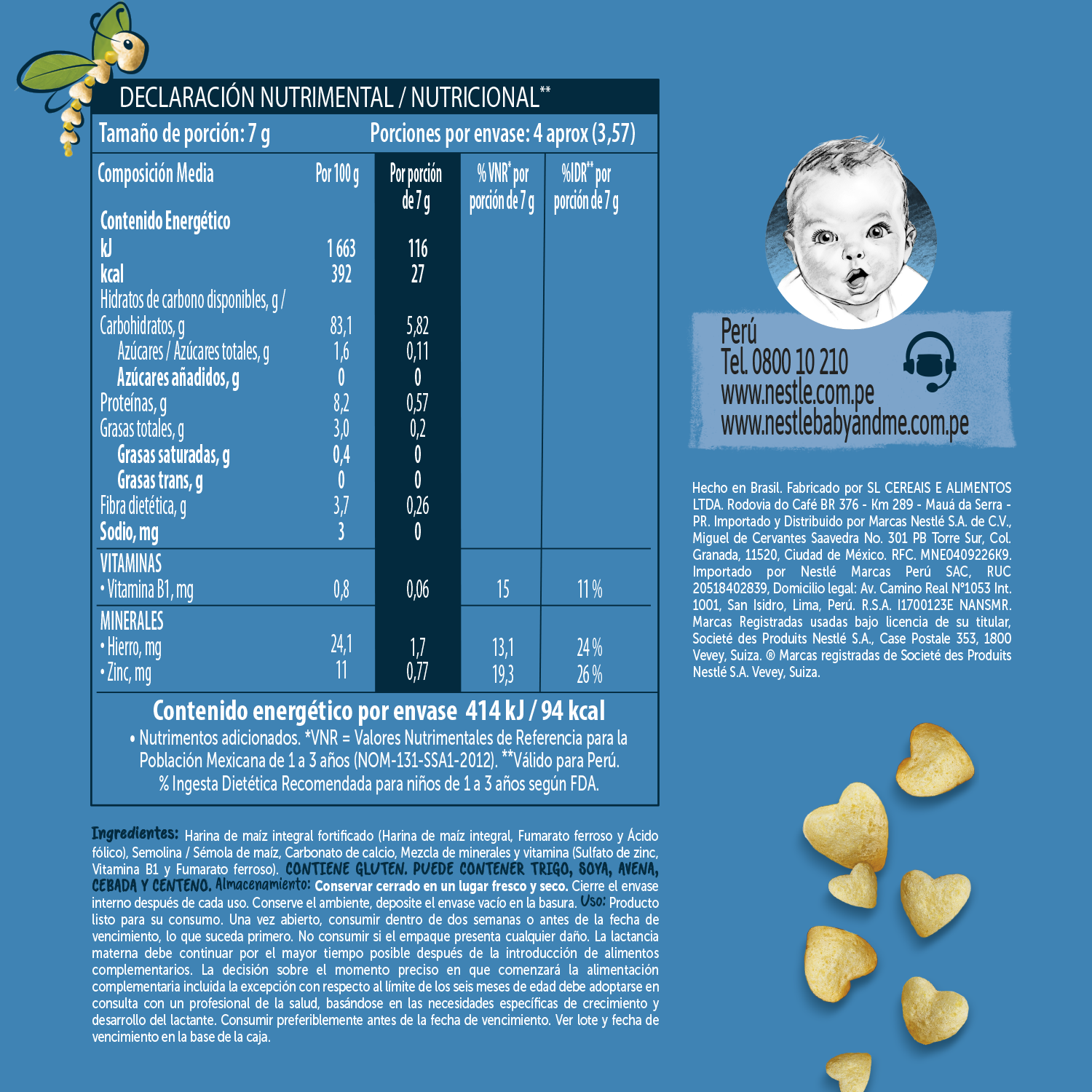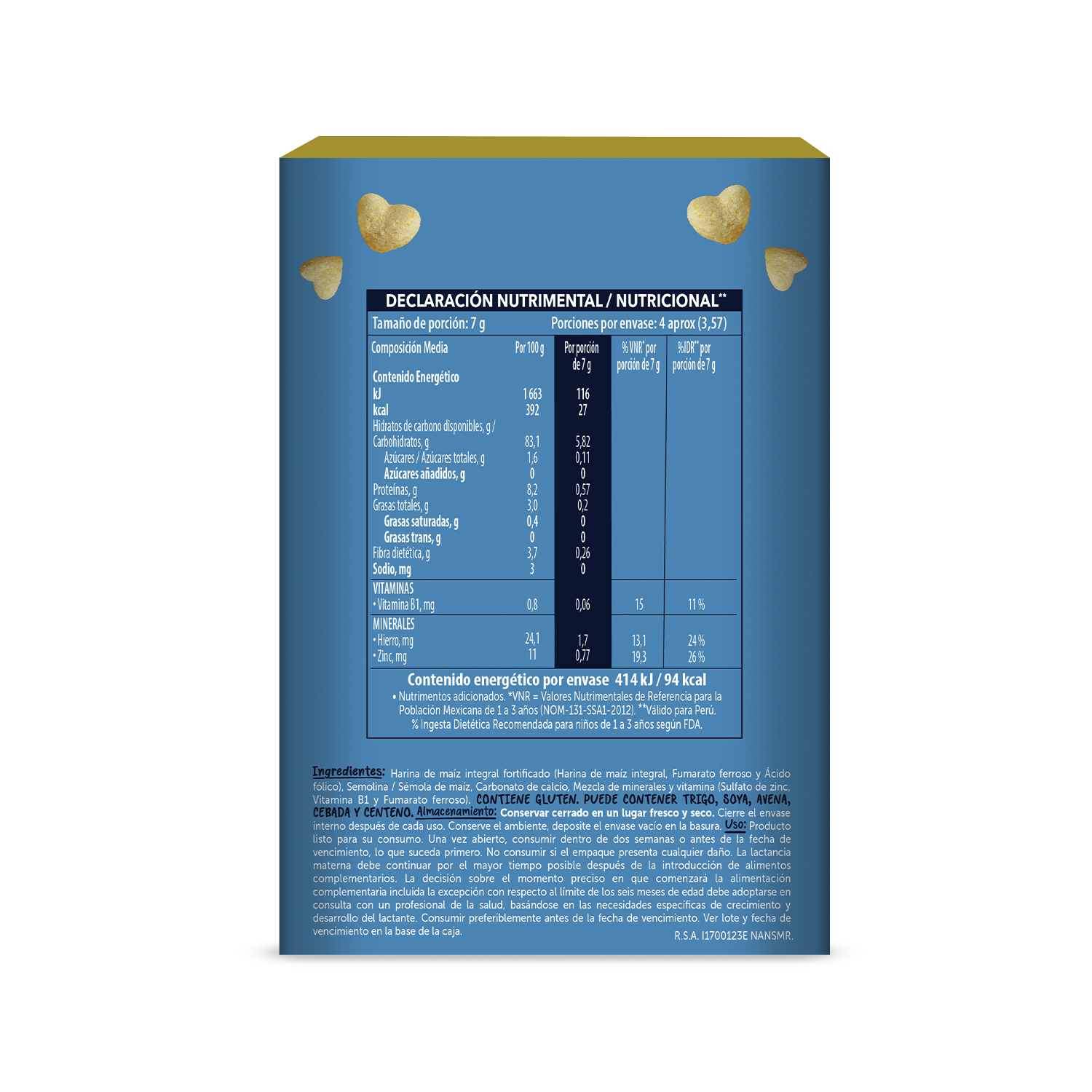 Cereal a base de harina de maíz, con vitaminas y minerales para niños pequeños. Porción sugerida 7g.
