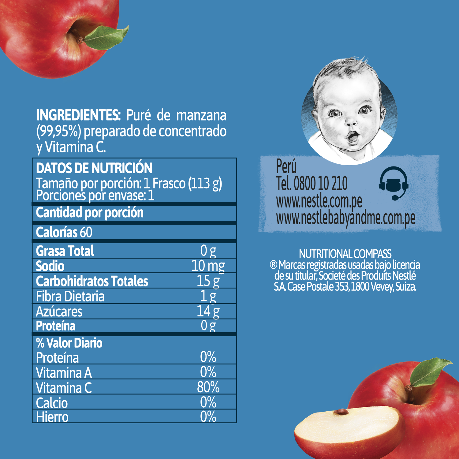Puré de manzana (99,95%) preparado de concentrado y Vitamina C. Porción sugerida 113gr.