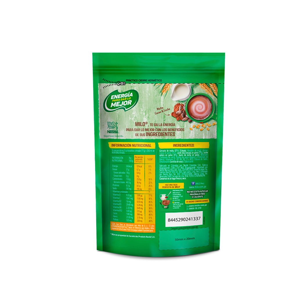 Extracto de malta (35%) [Cebada y Almidón de yuca], Azúcar, Leche entera en polvo, Cacao en polvo, Suero de leche en polvo, Minerales (Fosfato de calcio dibásico y Pirofosfato de hierro), Cloruro de sodio, Emulsionante (Lecitina de soya), Vitaminas (C, B3, B6, B2, D y B12), Regulador de acidez (Bicarbonato de sodio) y Saborizante
