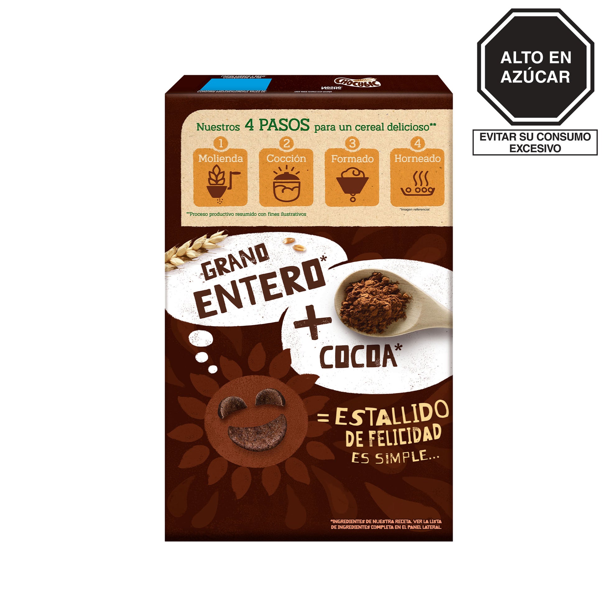 Cereales (60,6%) [Harina de Maíz Integral (23,6%), Harina de Trigo (19,6%), Harina de Trigo Integral (17,4%)], Azúcar, Cacao en polvo (6,1%), Extracto de Malta (Cebada), Aceite de palma fraccionado (con antioxidante: palmitato de ascorbilo), Vitaminas y Minerales (Carbonato de Calcio, Niacina, Óxido de zinc, Pantotenato de Calcio, Hierro reducido, Vitamina B1, Vitamina B6, Vitamina B2 y Ácido Fólico), Emulsionante (Fosfato dicálcico), Sal, Licor de Cacao (0,5%), Saborizante Idéntico al Natural, Antioxidante (Concentrado de Tocoferoles Mixtos).