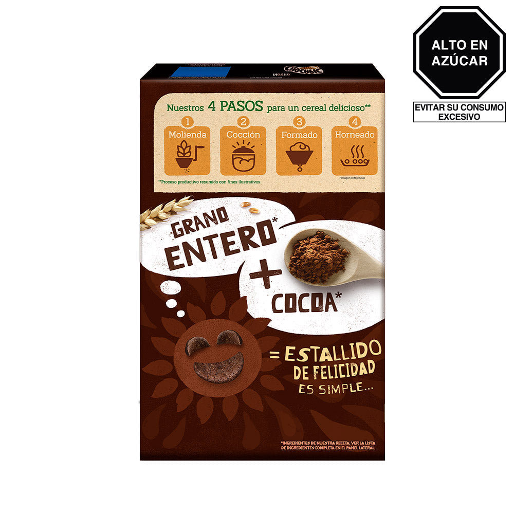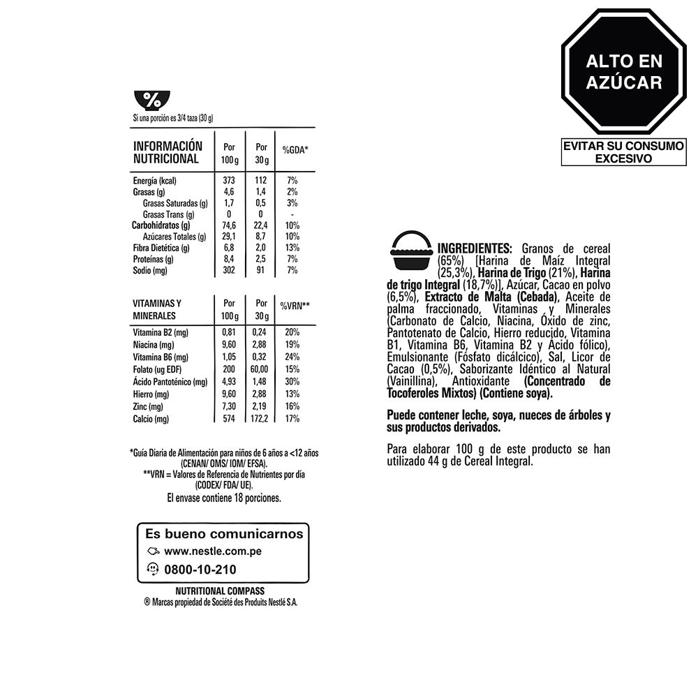 GranosdeCereal(65)[HarinadeMaízIntegral(25,3%),HarinadeTrigo(21%),HarinadeTrigoIntegral(18,7%)],Azúcar,Cacaoenpolvo(6,5%),ExtractodeMalta(Cebada),Aceitedepalmafraccionado,VitaminasyMinerales(CarbonatodeCalcio,Niacina,Óxidodezinc,PantotenatodeCalcio,Hierroreducido,VitaminaB1,VitaminaB6,VitaminaB2yÁcidoFólico),Emulsionante(Fosfatodicálcico),Sal,LicordeCacao(0,5%),SaborizanteIdénticoalNatural(Vainillina),Antioxidante(ConcentradodeTocoferolesMixtos)(Contienesoya)