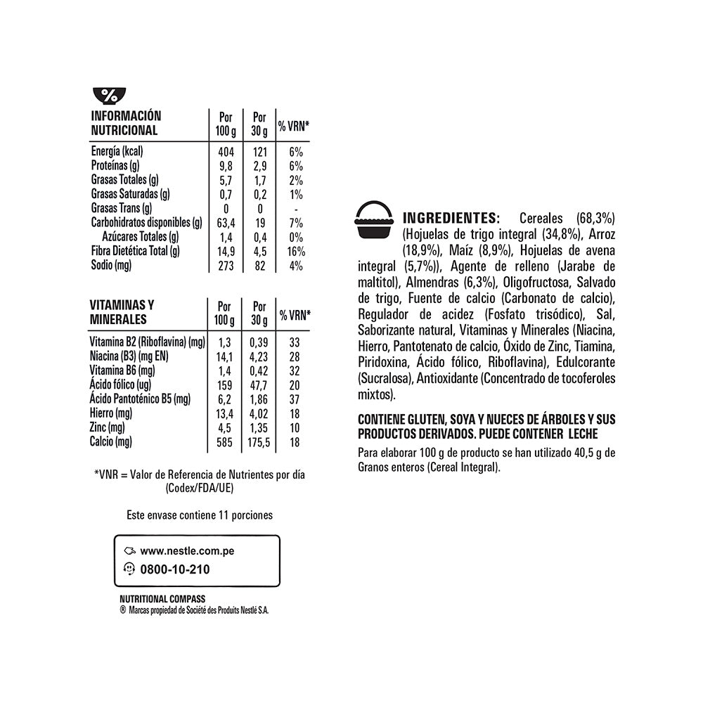 Granos de cereales (64%) (Grano de trigo integral (29,5%), Arroz (19,6%) y Maíz (9,7%), Avena integral (5,2%)), Azúcar, Almendras (6,5%), Salvado de trigo, Jarabe de glucosa, Miel (2,4%), extracto de malta (cebada), jarabe de azúcar parcialmente invertido, Emulsificante (monoglicéridos de ácidos grasos), sal yodada, regulador de acidez (Fosfato Trisódico), Saborizante natural a miel, Antioxidantes (tocoferoles). Vitaminas y minerales: Carbonato de Calcio, Vitamina B3 (Niacina), Zinc, Hierro, Vitamina B5 (Ácido Pantoténico), Vitamina B1 (Tiamina), Vitamina B6 (Piridoxina), Vitamina B2 (Riboflavina) y Vitamina B9 (Ácido fólico).