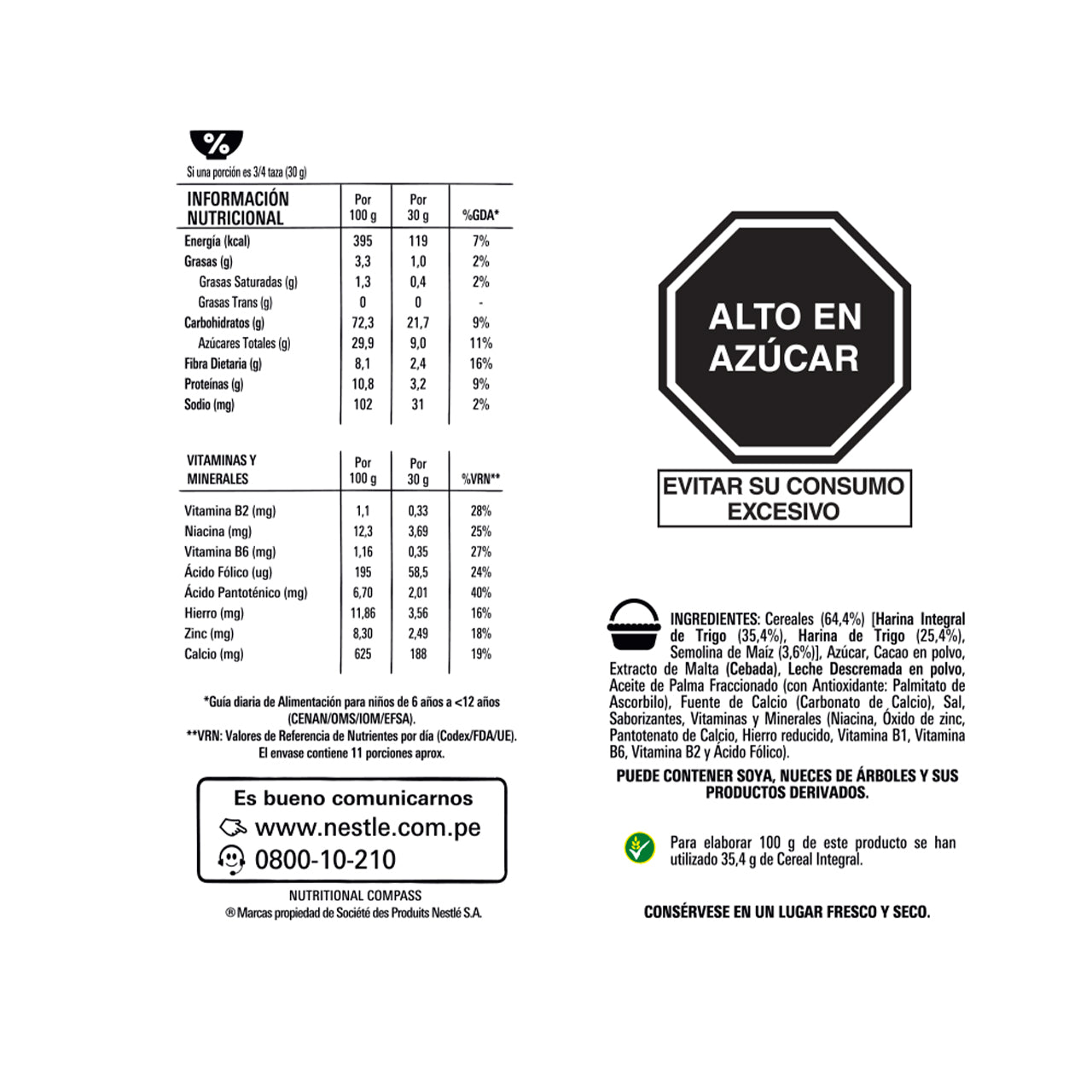 Cereales (64,4%) (Harina Integral de Trigo (35,4%), Harina de Trigo (25,4%), Semolina de Maíz (3,6%), Azúcar, Cacao en polvo (6,7%), Extracto de Malta (Cebada), Leche Descremada en pol (3,4%), Oleína de Palma (con Antioxidante: Palmitato de Ascorbilo), Fuente de calcio (Carbonato de Calcio), Sal, Saborizante Idéntico al Natural, Saborizante Natural. Vitaminas y minerales: Niacina, Ácido Pantoténico, Vitamina B6, Vitamina B2, Vitamina B1, Ácido Fólico, Hierro reducido y Óxido de Zinc.