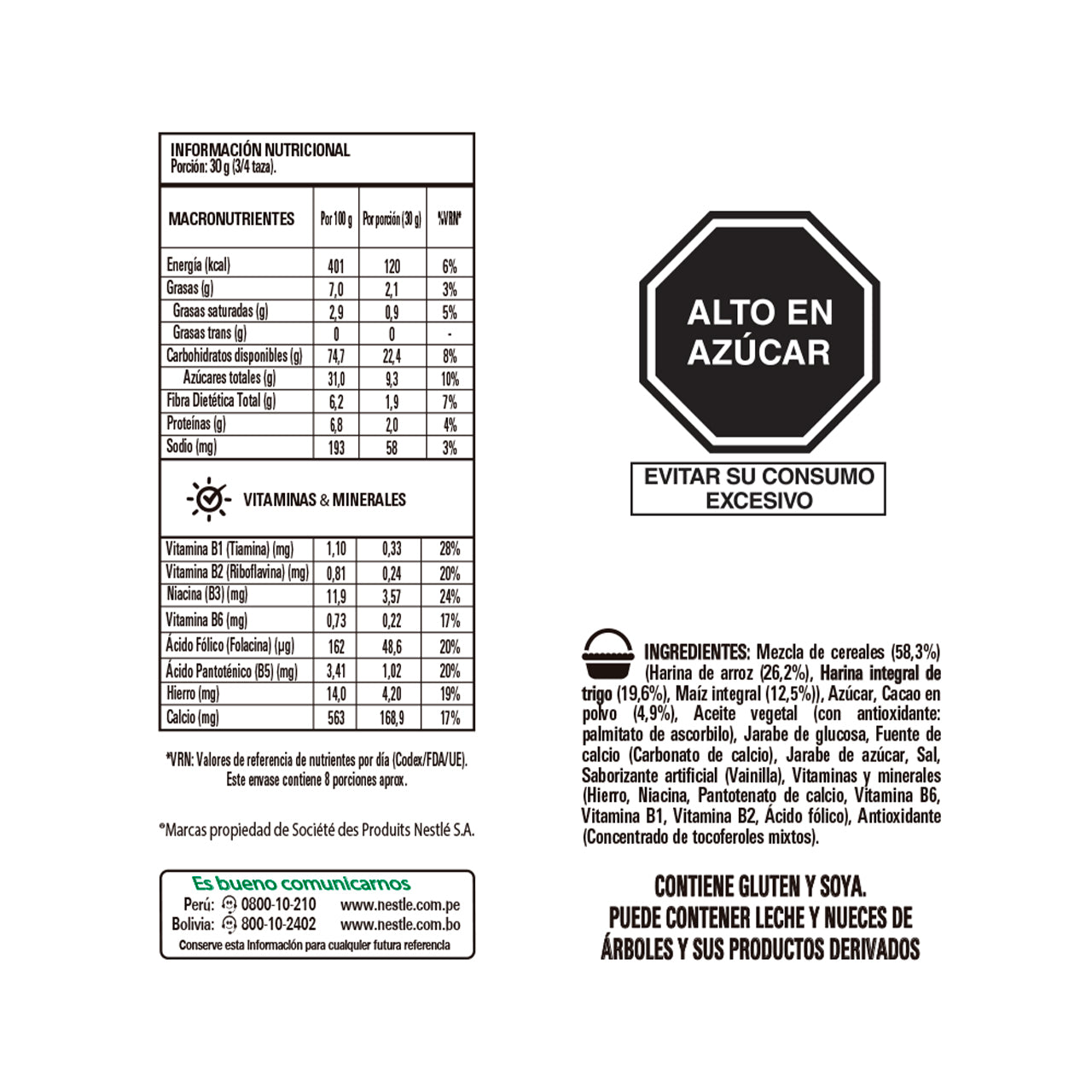 Ingredientes: Mezcla de cereales, Harina de arroz (26,3%), Harina de trigo (19,5%), Maíz (12,5%), Azúcar, Cacao en polvo (4,9%), Aceite Vegetal (antioxidante: palmitato de ascorbilo), Jarabe de Glucosa, Fuente de calcio (Carbonato de calcio), Jarabe de azúcar, Sal, Saborizante (Vainilla), Vitaminas y minerales (Hierro, Niacina, Pantontenato de calcio, Vitamina B1, Vitamina B5, Vitamina B2 y Ácido fólico), Ácido fólico, Antioxidante (Concentrado de tocoferoles mixtos) y Fuente de hierro (Hierro reducido).