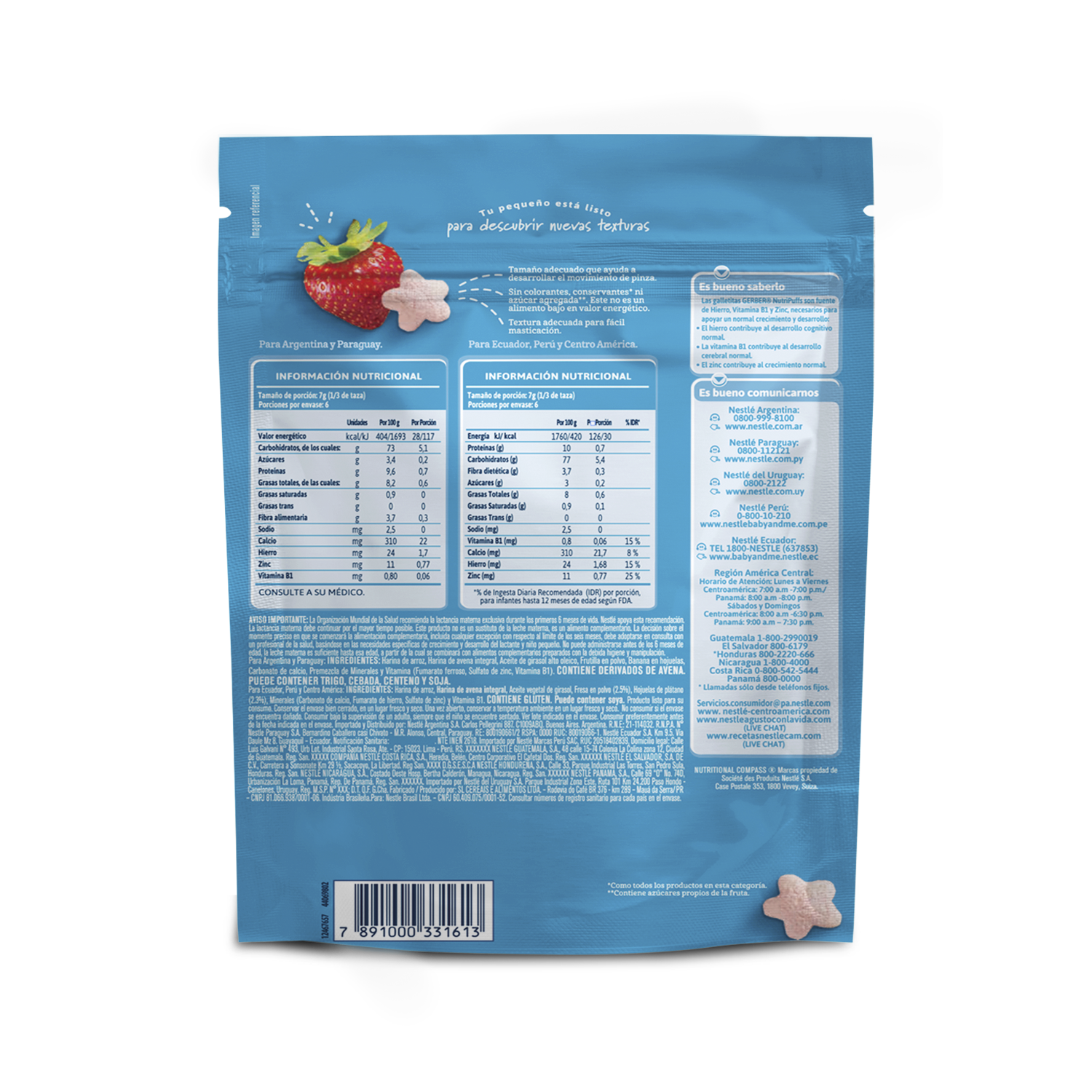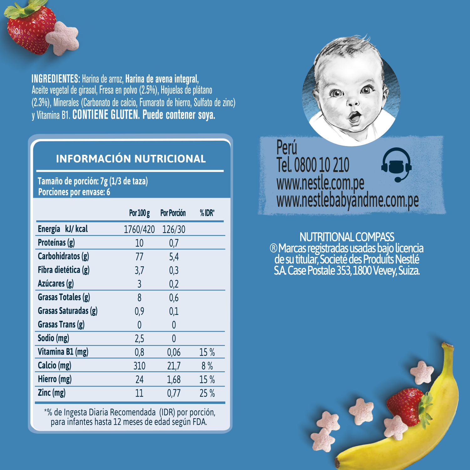 Harina de arroz, Harina de avena integral, aceite vegetal de girasol, Fresa en Polvo (2.5%),Hojuelas de plátano (2.3%),Minerales (Carbonato de calcio, Fumarato de Hierro, Sulfato de Zinc) y Vitamina B1.
