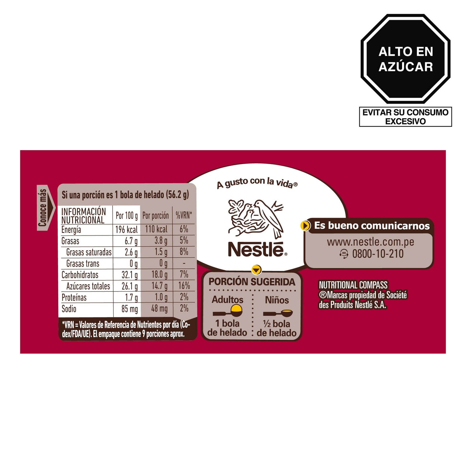 Agua, Salsa con pulpa de arándanos [Azúcar, Glucosa, Pulpa de arándanos, Agua, Estabilizantes (Fosfato de hidroxipropil dialmidón y Goma xanthana), Regulador de acidez (Ácido cítrico), Colorantes (Caramelo IV - Caramelo al sulfito amónico y Carmines), Sustancia conservadora (Sorbato de potasio) y Saborizante], Azúcar, Galleta sabor a vainilla [Harina de trigo fortificada (Hierro, Vitaminas: B1, B2, B3 y Ácido fólico), Azúcar, Aceite vegetal (Contiene soya), Jarabe de azúcar invertido, Sal, Leudantes (Carbonato ácido de sodio, Carbonato ácido de amonio, Fosfato diácido de calcio), Emulsionantes (Lecitina de soya, Ésteres diacetiltartáricos y de ácidos grasos de glicerol), Saborizante y Agente de tratamiento de la harina (Metabisulfito de Sodio)], Aceite vegetal ( Contiene soya), Suero de leche en polvo, Jarabe de glucosa, Leche descremada en polvo, Fibra soluble de maíz, Estabilizantes [Goma guar, Goma de semilla de algarrobo, Carboximetilcelulosa sódica (Goma de celulosa) y Carragenina semirefinada), Emulsionante (Monoglicéridos y diglicéridos de ácidos grasos), Saborizantes, Regulador de acidez (Ácido cítrico) y Colorantes [Extractos de Annato (Base de Norbixina) y Carmines]