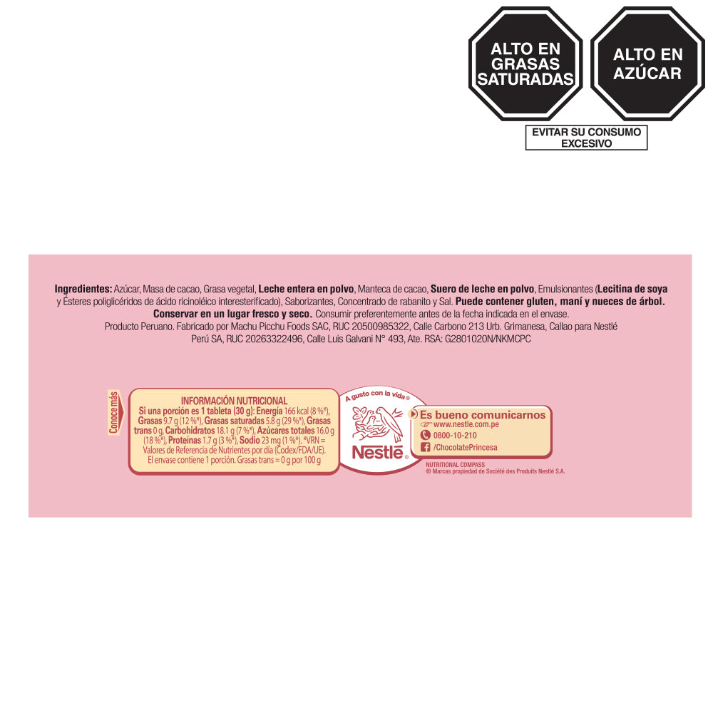 Azúcar, Masa de cacao, Grasa vegetal, Leche entera en polvo, Manteca de cacao, Suero de leche en polvo, Emulsionantes (Lecitina de soya y Ésteres poliglicéridos de ácido ricinoléico interesterificado), Sal, Saborizantes, Concentrado de rabanito y Sal.