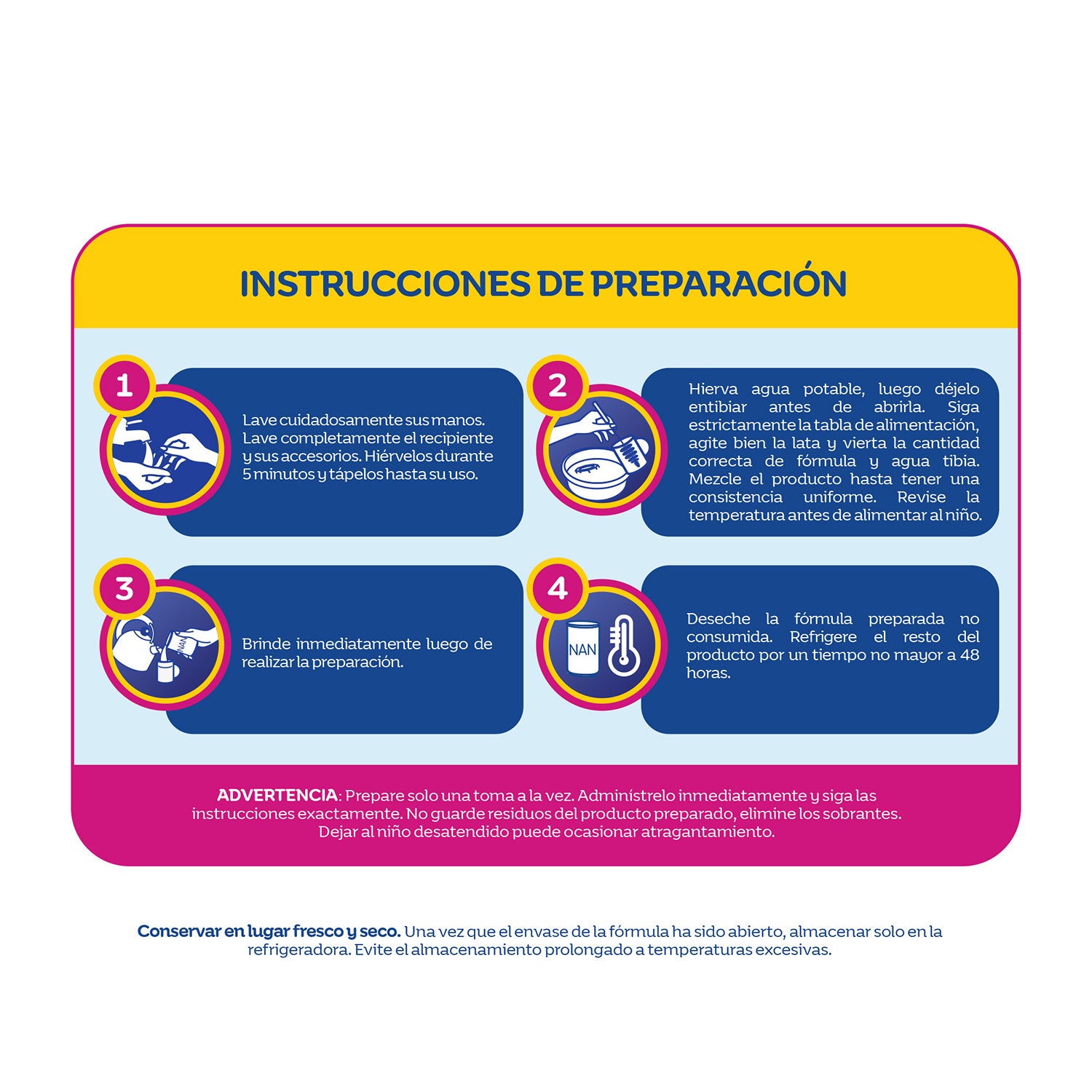 Conservar en un lugar fresco y seco. Una vez que el envase de la fórmula ha sido abierto, almacenar solo en la refrigeradora.
