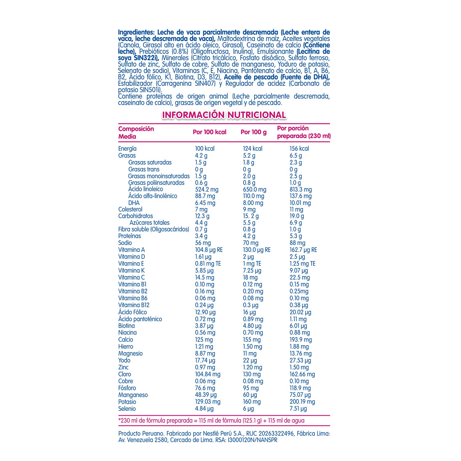 Leche de vaca parcialmente descremada (Leche entera de vaca, leche descremada de vaca) , Maltodextrina de maíz, Aceites vegetales (Canola, Girasol alto en ácido oleico, Girasol), Caseinato de calcio (Contiene leche), Prebióticos (Oligofructosa, Inulina),Emulsionante (Lecitina de soya SIN322), Minerales (Citrato tricálcico, Fosfato disódico, Sulfato ferroso, Sulfato de zinc, Sulfato de cobre, Sulfato de manganeso, Yoduro de potasio, Selenato de sodio), Vitaminas (C, E, Niacina, Pantotenato de calcio, B1, A, B6, B2, Ácido fólico, K1, Biotina, D3, B12), Aceite de pescado (Fuente de DHA), Estabilizador (Carragenina SIN407) y Regulador de la acidez (Carbonato de potasio SIN501i).