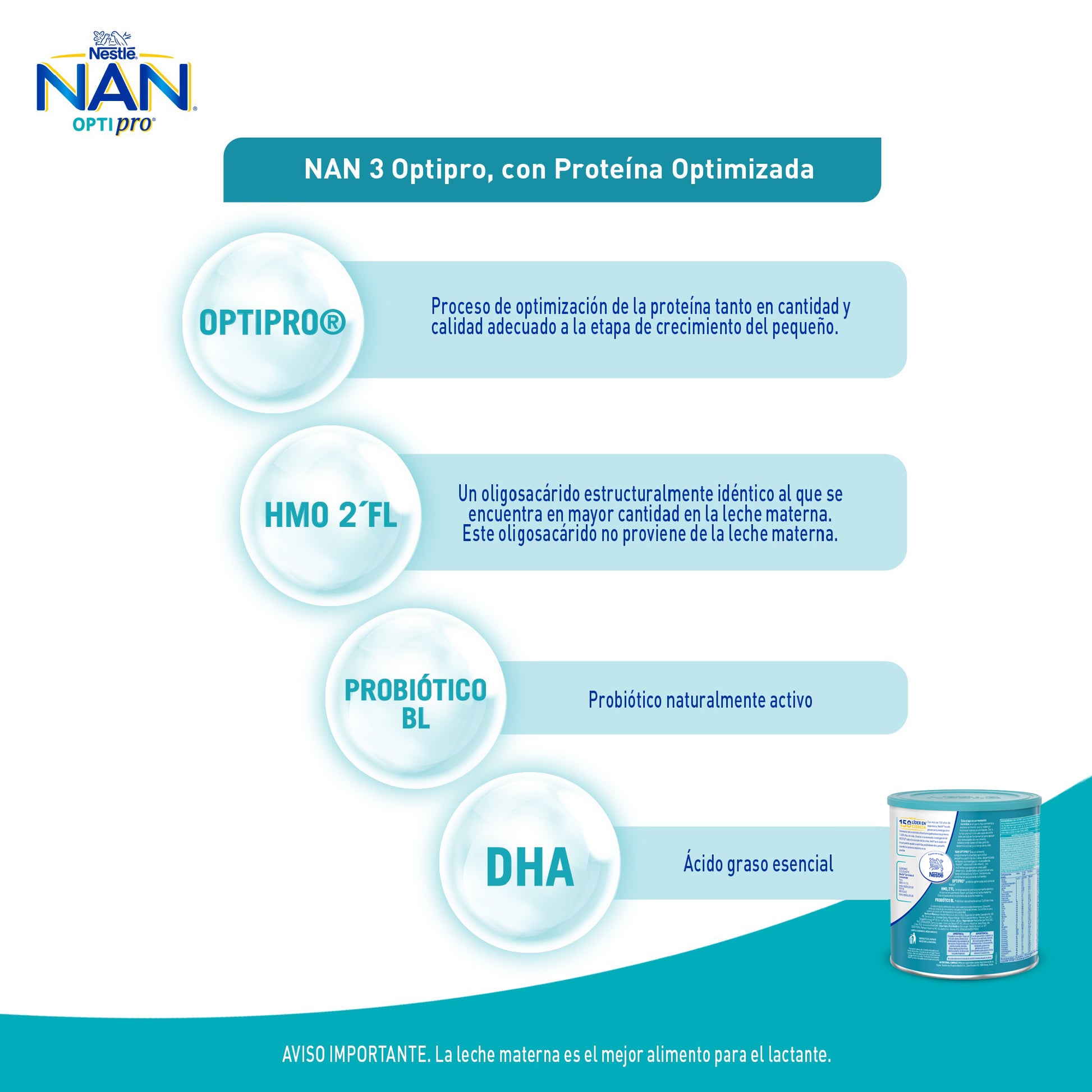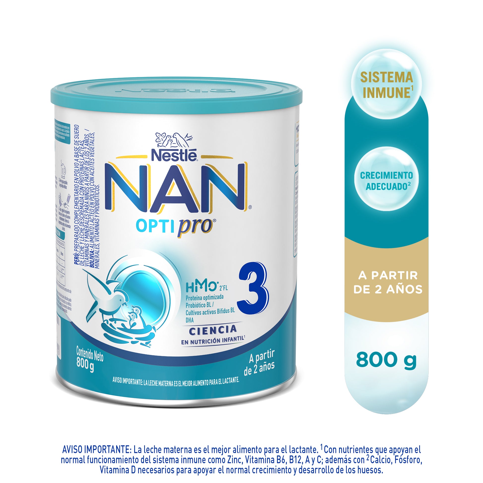 Lata Nan 3 Optipro 800gr (2-3 porciones al día de 210ml) Para niños a partir de los 2 años, es un preparado complmentario en polvo con proteinas lacteeas vitaminas y minerales, además de HMO porbióticos B. Lactis y DHA.